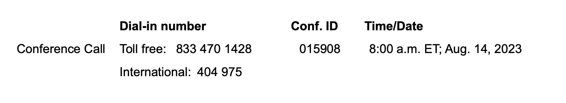 To access the call, we encourage you to pre-register at https://events.q4inc.com/attendee/913475865. After registering, a confirmation will be sent via email and will include dial-in details and a unique PIN code for entry to the call. Registration will be open throughout the live call. You may also access the call and register with a live operator. The conference call will last approximately one hour. Participants should plan to dial in 15 minutes prior to the session. Dial-in details of the call are as follows:
